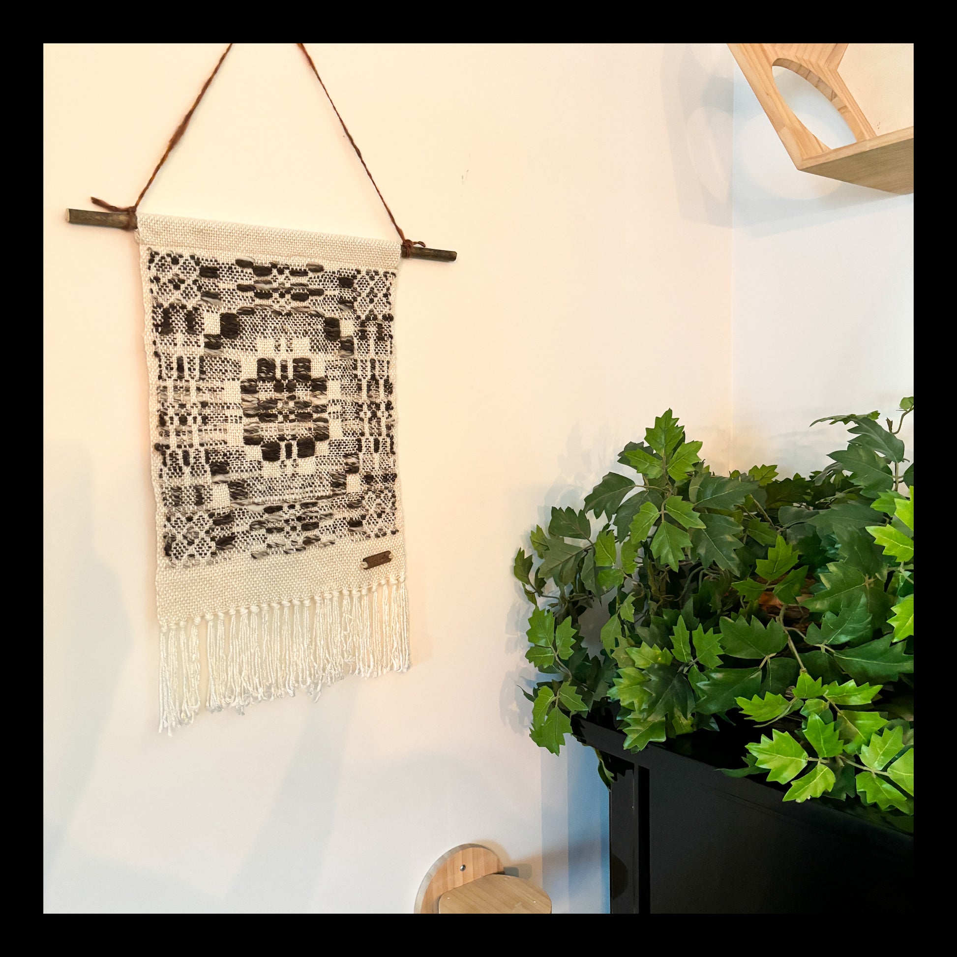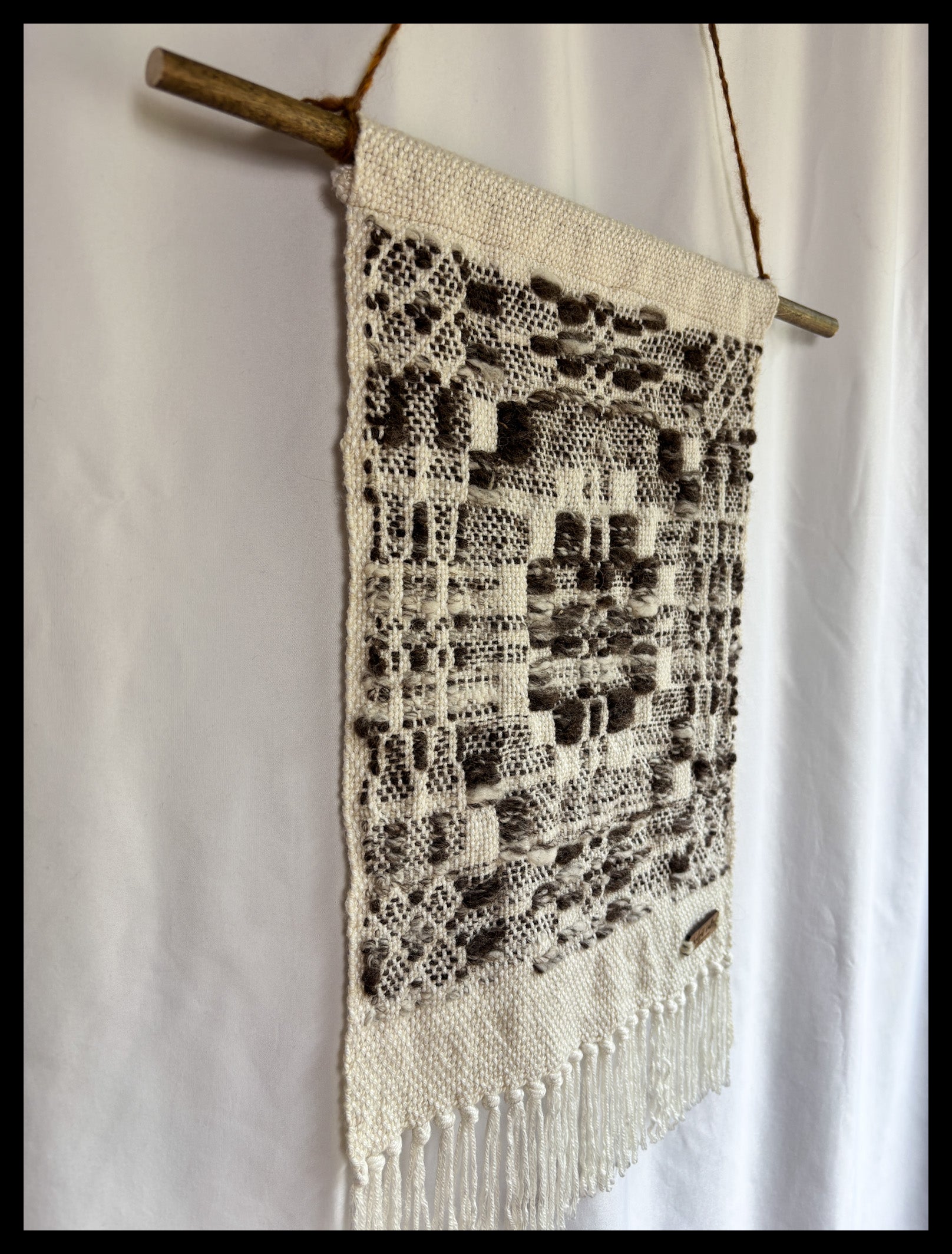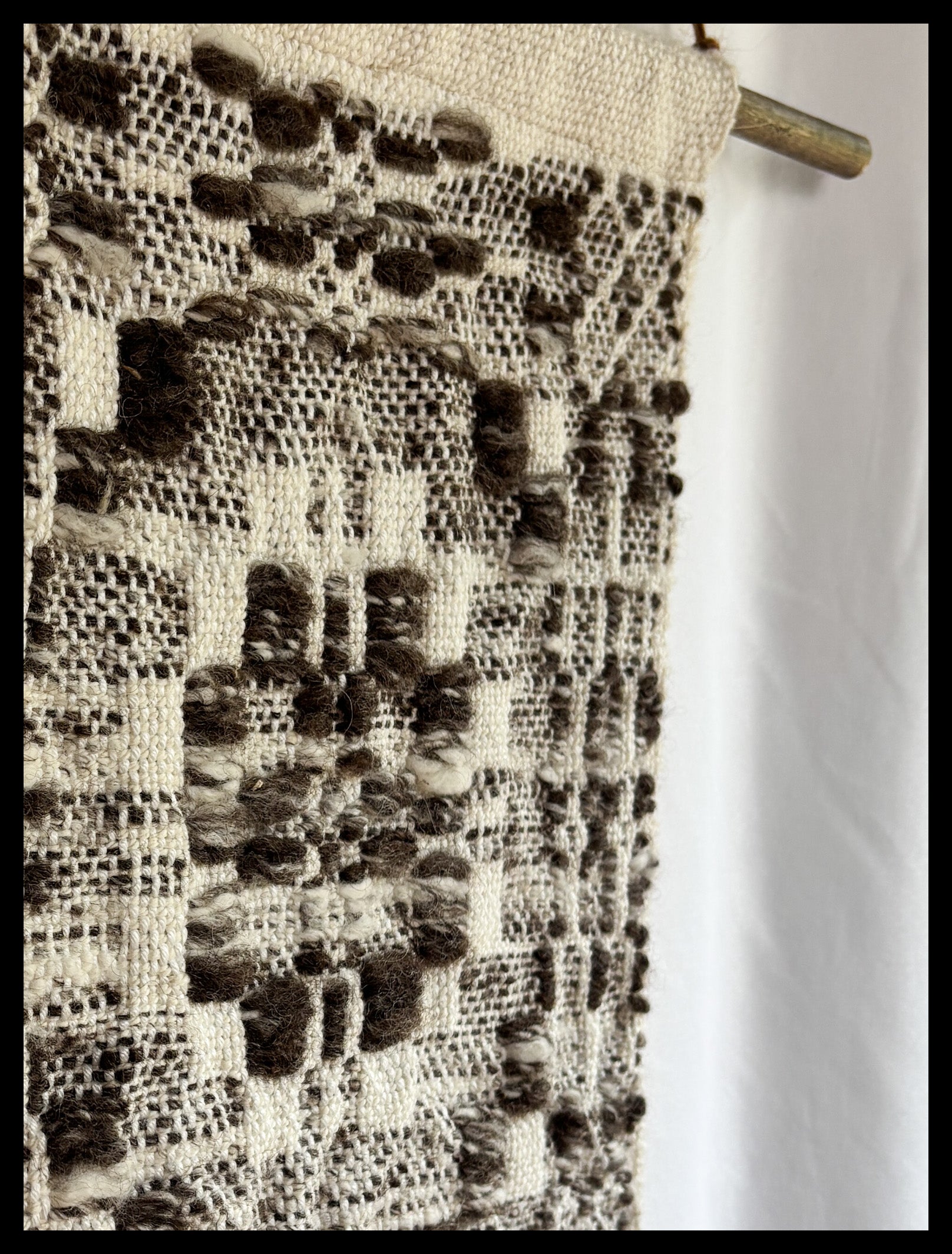 This piece features hand washed, carded and spun wool from two sheep named Kiwi (Blue Faced Leicester breed) and Gamora (BFL/Clun Foest/Dorset breed). Both sheep are from Loch Loch Lomond Livestock in Saskatchewan. The Wool is highlighted int he overshot pattern wear, while the background is commercial bamboo yarn.